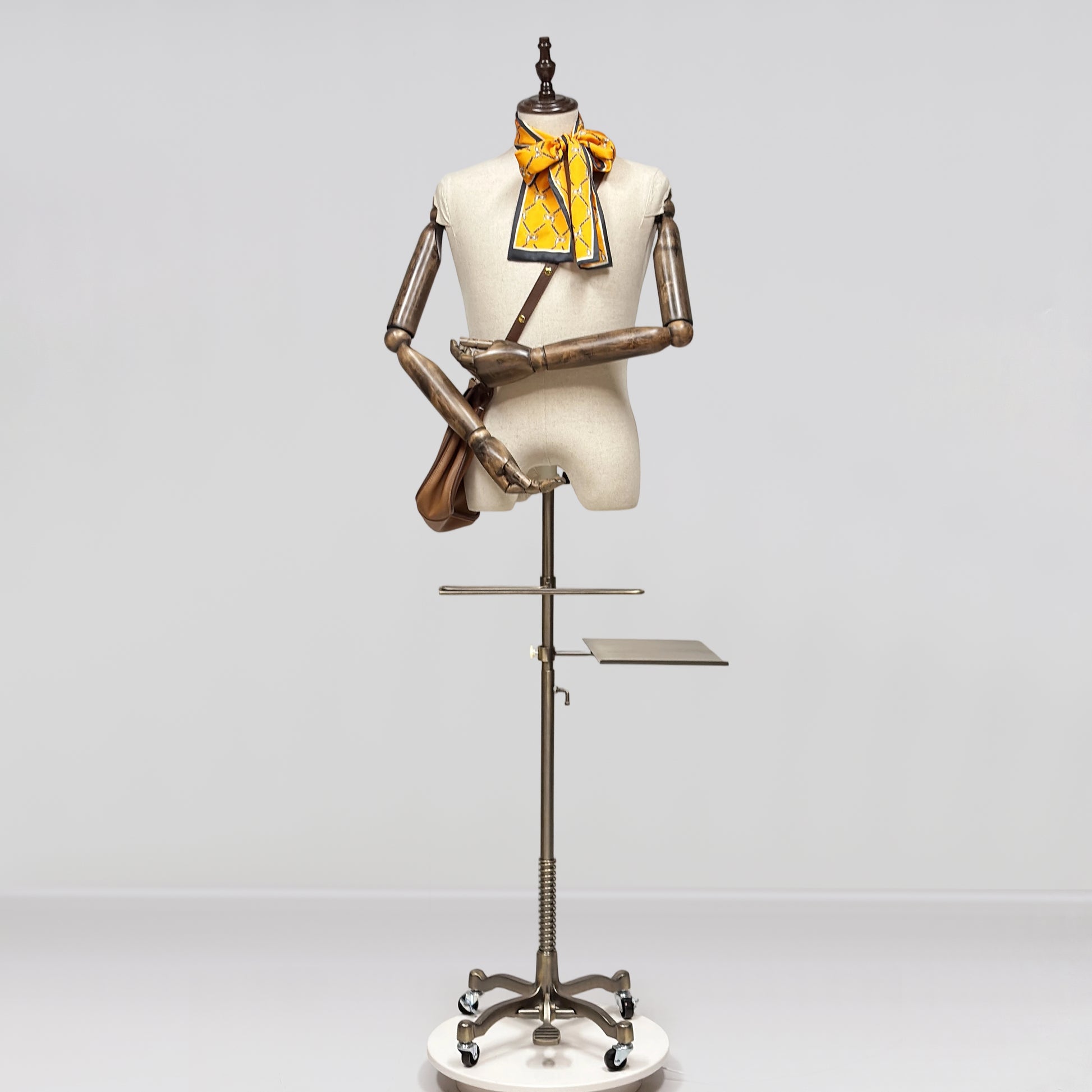 This tailor mannequin is designed to showcase men’s suits, tuxedos, jackets, and other formalwear with elegance and precision. The off-white linen fabric offers a refined texture and neutral tone that enhances the details of any garment. Combined with adjustable wooden arms and a sturdy rolling base, it’s both practical and stylish for store display or tailoring use.
