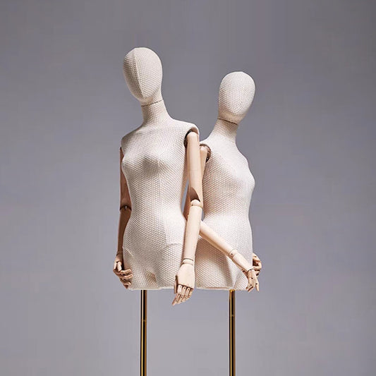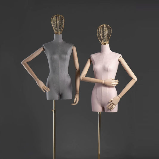 Mannequin femme demi-corps avec base dorée, tête amovible, mains en bois et support doré réglable en hauteur, mannequin femme en daim DL0061