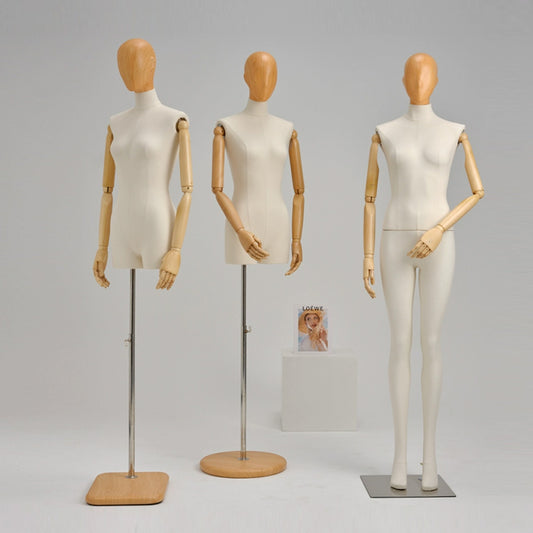 Mannequin demi-corps féminin, présentoir de vêtements, mannequin de robe en daim, bras et base en bois pour vitrine de magasin de vêtements/robes,