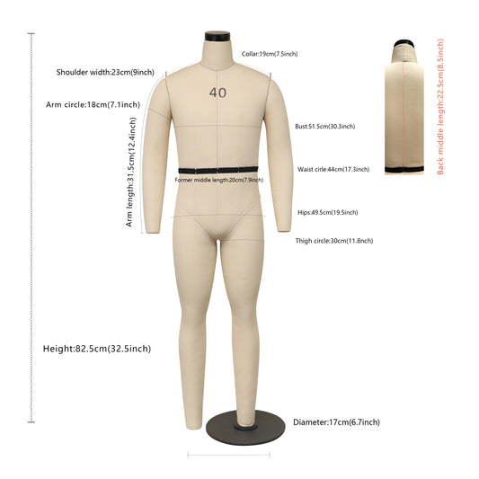 Mannequin de couture pour homme à demi-échelle DL264 1/2 Mannequin de tailleur pour homme avec bras souples de 32 cm, mannequin de couture pour homme à demi-taille, mannequin d'ajustement de 48 cm
