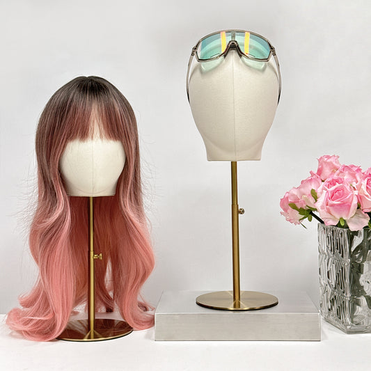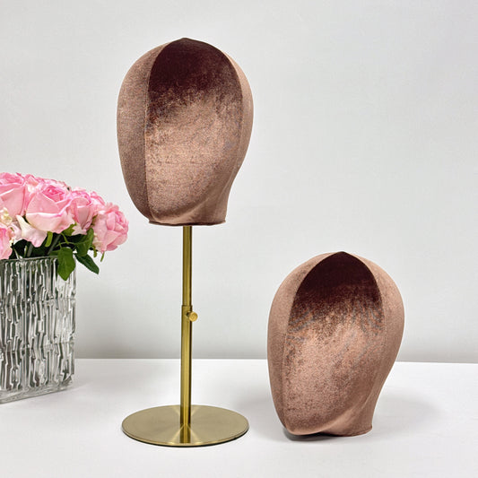DE-LIANG Brown Velvet Mannequin Head with Gold Adjustable Base – Luxury Hat, Wig & Sunglasses Display Stand