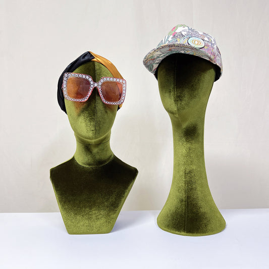 DE-LIANG Luxurious Olive-Green Velvet Head Mannequin,Can Pinnable Cloth Foam Head,Female Mannequin, Head Hat Stand/Display, Lace Head Wig Stand, Hat Rack W/ Fabric