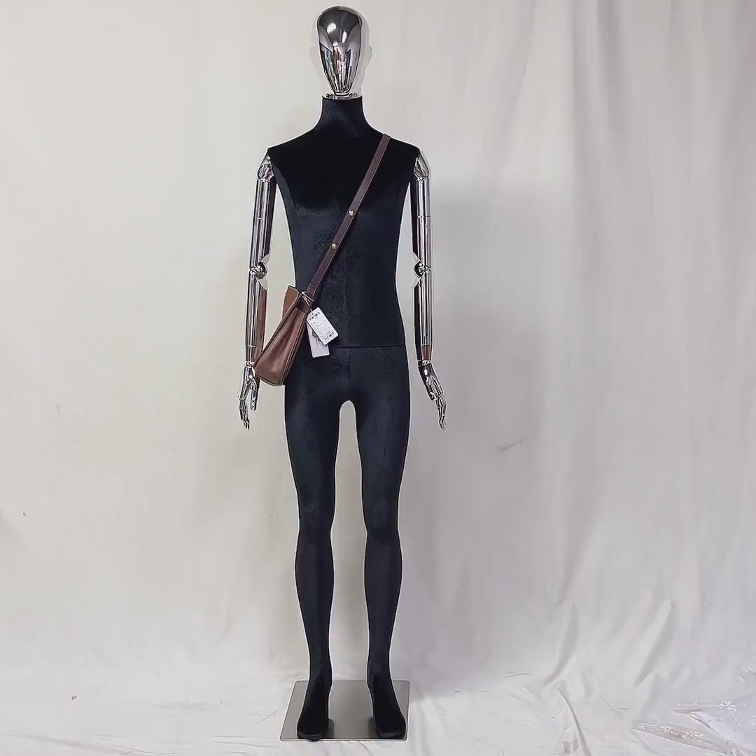 DE-LIANG Black Velvet Male Full Body Mannequin: Silver Arms & Base, Men Display mannequin