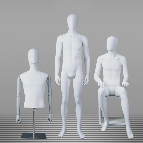 Available in full-body standing, sitting, and half-body models with adjustable arms, this set offers versatile options for showcasing men’s clothing—from casual wear to formal suits and sports apparel.