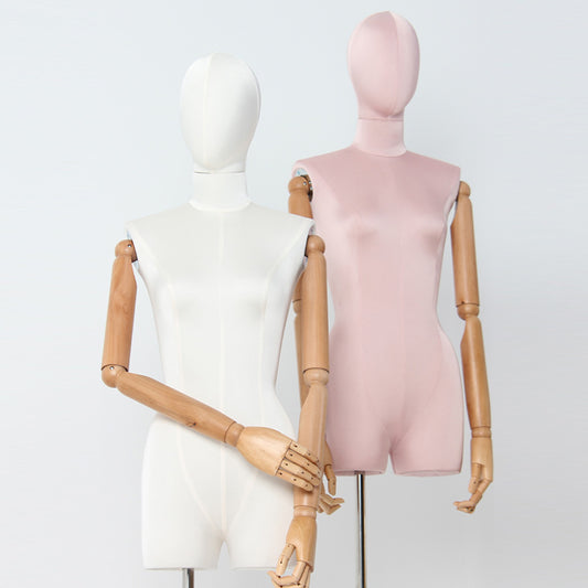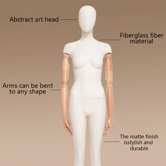 DE-LIANG Female Mannequin – Beige Linen Dress Form with Wooden Arms & Stand, Full/Half Body for Boutique Displays & Fashion Showrooms