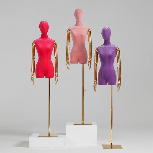 DE-LIANG Velvet Female Half Body Mannequin With Head,Adjustable Display Mannequin with Plated Golden Arms,Pink Color Women Torso Dress Form for Window Clothes Display,Boutique