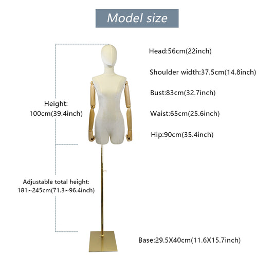 DE-LIANG Fabric Cover Female Half Body Mannequin Torso Metal Base with Wooden Arm/Head for Wedding Clothing Display Adjustable Rack