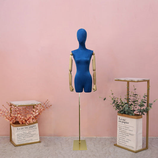 DE-LIANG Popular Female Half Body Suede Fabric Display Mannequin, Woman Torso Dress Form with Wooden Arms ,High Quality Mannequin Torso