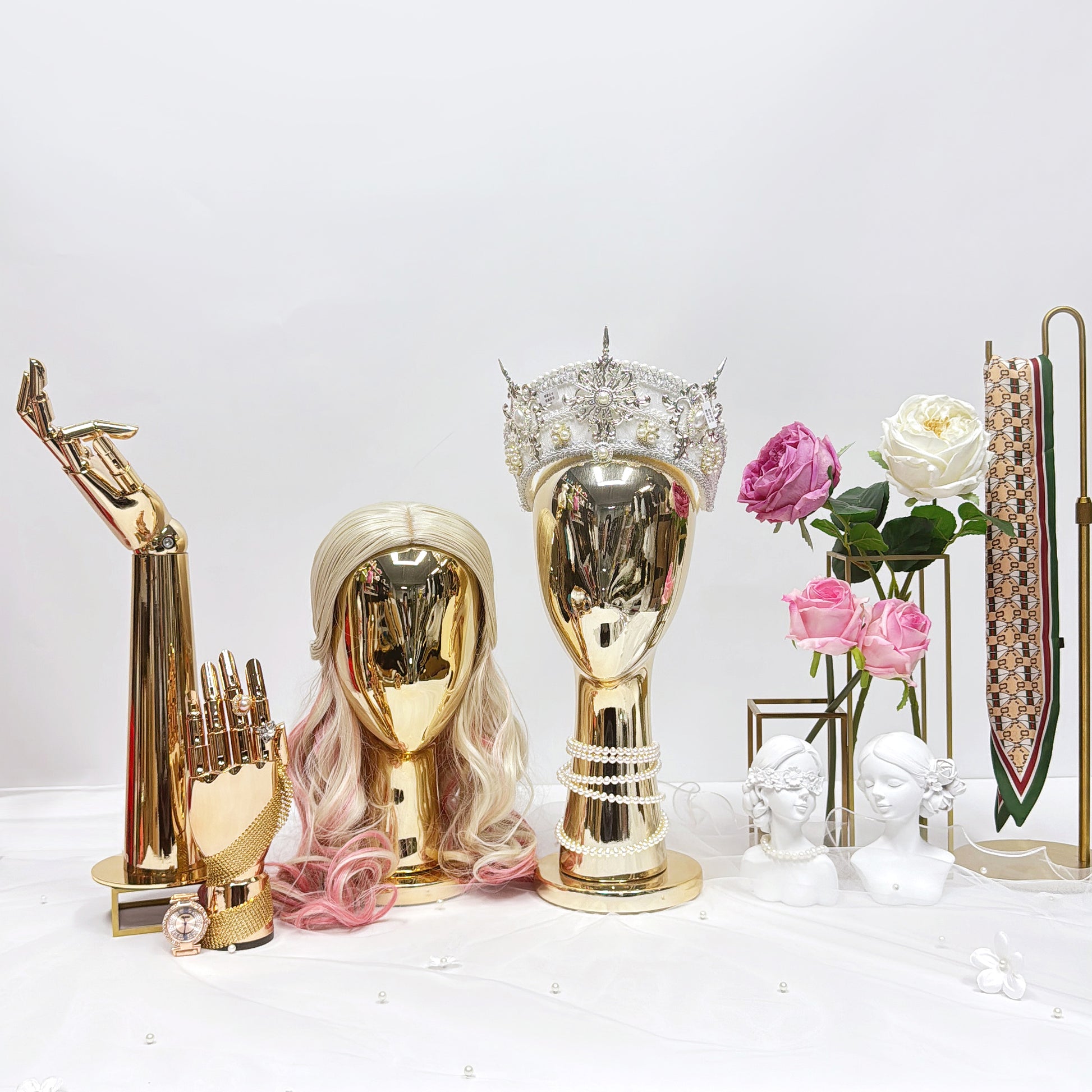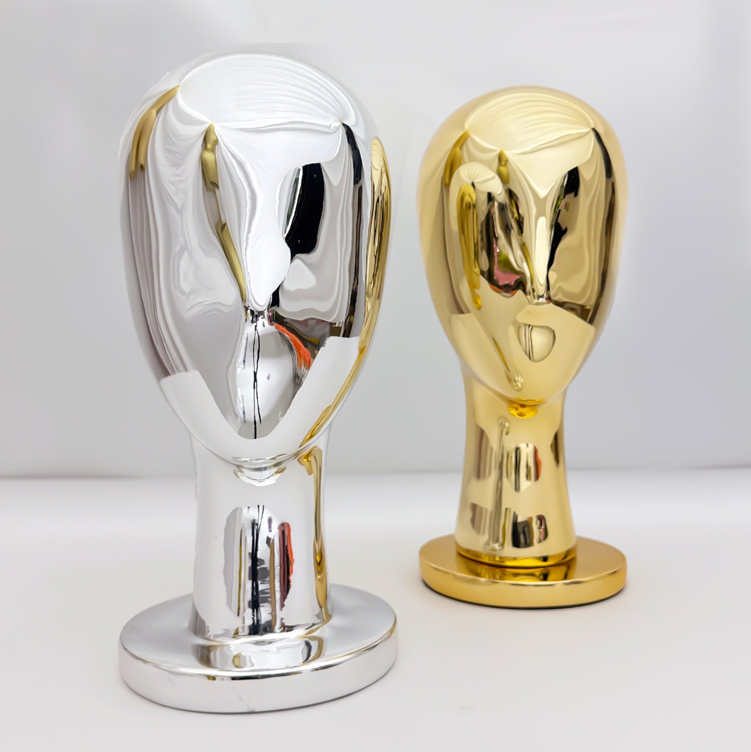 Upgrade your display with our high-gloss electroplated fiberglass head mannequins, available in two luxurious finishes: gold and silver. Designed for showcasing hats, wigs, scarves, and accessories, these mannequins exude elegance and sophistication.