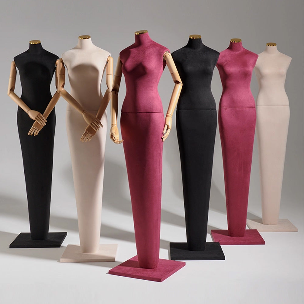 DE-LIANG Luxury Suede Female Mannequin with Articulated Wooden Arms - Modern Tapered Column Base for High-End Boutique & Couture Display