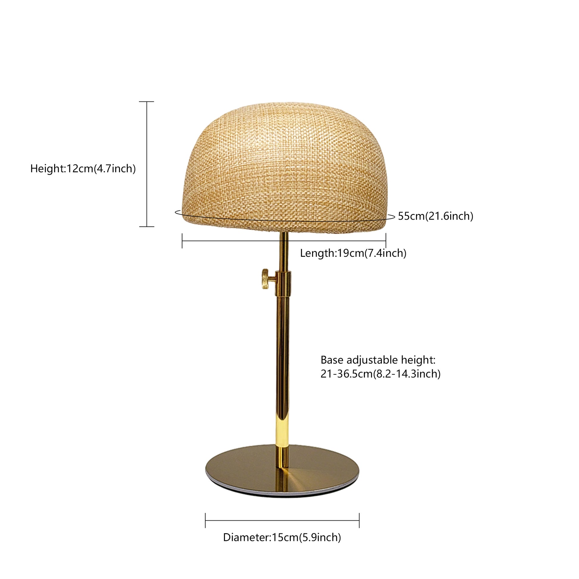 Both stands feature a polished gold electroplated iron base (15cm / 5.9" diameter) for a stable, wobble-free display on countertops, shelves, and display tables. The hat stand includes an adjustable height rod (21–36.5cm / 8.2–14.3") with a locking knob for easy height customization.
