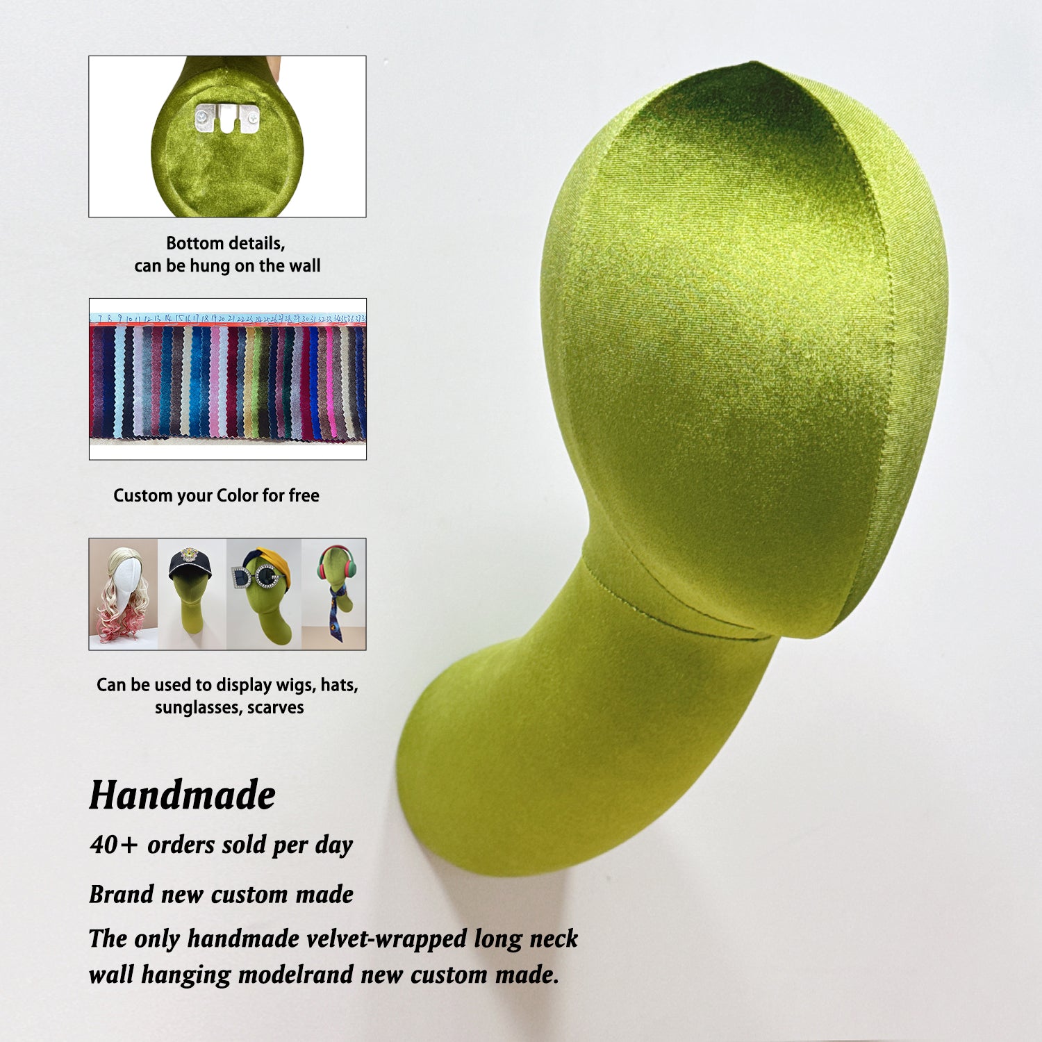 Display your wigs, hats, scarves, headphones, or fashion accessories with elegance using this wall-mounted head form wrapped in a striking combination of green and white velvet fabric. Built from durable fiberglass and upholstered in soft-touch velour, this display piece offers both strength and sophistication. Perfect for boutiques, salons, exhibitions, or stylish home décor, it combines space-saving design with an upscale, modern look.